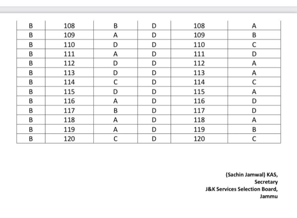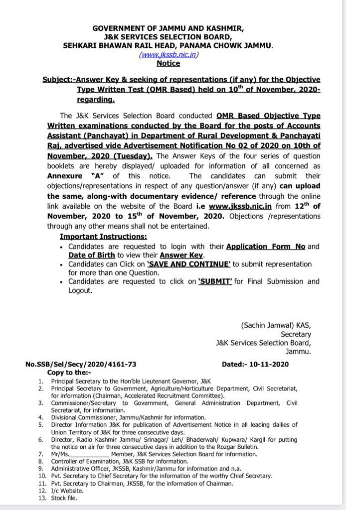 Srinagar, November 10: The Service Selection Board Examination on Tuesday made public the answer keys of the four series of question booklets for objective type written test held across Jammu and Kashmir for the posts of Accounts Assistant (Panchayat) in Rurual Development Department.