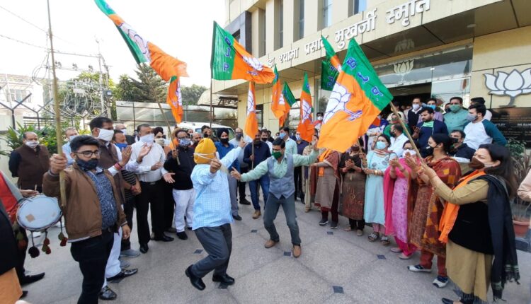 Jammu, November 11: Bharatiya Janata Party here on Wednesday celebrated party’s victory in Bihar assembly elections in a spectacular way at their party headquarter in Trikuta Nagar, Jammu, with triumphant leaders and activists dancing on the beats of traditional Drums, distributed sweets among themselves and the visitors as well as passersby and fired crackers on the occasion to show their delight.