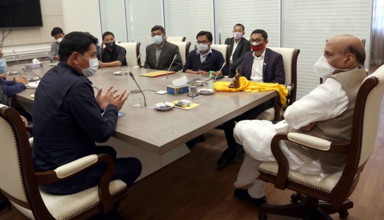 New Delhi, November 12: A delegation from Ladakh comprising BJP MP Jamyang Tsering Namgyal, newly elected Chief Executive Councillor of the Ladakh Autonomous Hill Development Council Tashi Gyalson advocate and Executive Councilor for Animal and Sheep Husbandry Tashi Namgyal Takzee called on the Defence Minister Rajnath Singh on Thursday and demanded establishment of a separate Command in Ladakh, extension of Battalion in Ladakh Scout Regiment