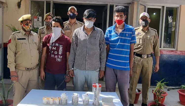 Jammu:A police party of PS Domana led by SHO P/S Domana Inspr. Mahesh Sharma assisted by PSI Nitish Khajuria while on patrolling duty in Anand Nagar area rounded up three suspects namely 1.) Abhilash Koul S/o Ashok Kumar Koul R/o Hazuri bagh Talab Tillo Bohri 2.) Kunal Manhas S/o Chamail Singh R/o Tali Morh New Plot Jammu 3.) Akshay Sharma S/o Rishi Sharma R/o Lower Muthi Jammu.On search of their belongings, 156 psychotropic injections were recovered from them. The details are as under: