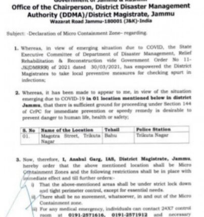 DC Jammu Anshul garg declares part of Trikuta Nagar as Micro Containment Zone. Uncategorized By Editor Last updated Apr 14, 2021 66 Share 66 Share