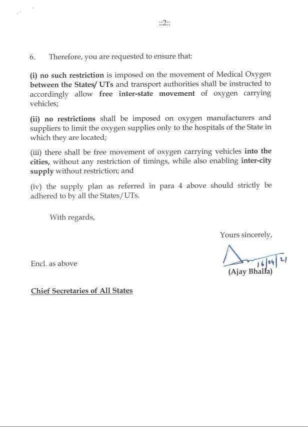 Union Home secretary Ajay Bhalla writes to all states to ensure free inter-city, interstate transportation of Oxygen and free movement for vehicles of Oxygen manufacturers without any time limit. Uncategorized By Editor Last updated Apr 16, 2021 106 Share 106 Share