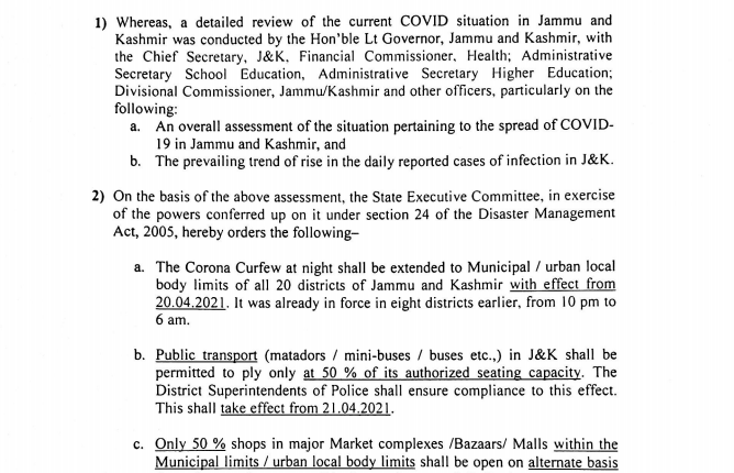 Jammu & Kashmir restrictions for COVID19 containment; ‘Corona curfew’ from 10pm to 6 am extended to all 20 districts, public transport to ply with 50% seating capacity and markets to open with 50 % shops on rotation bases.