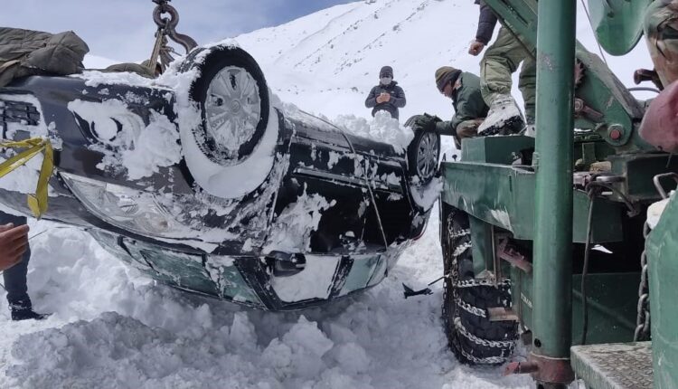 Indian Army rescued 10 civilians and three vehicles at Khardung La top, Ladakh following snow slides in the region on April 21: Indian Army