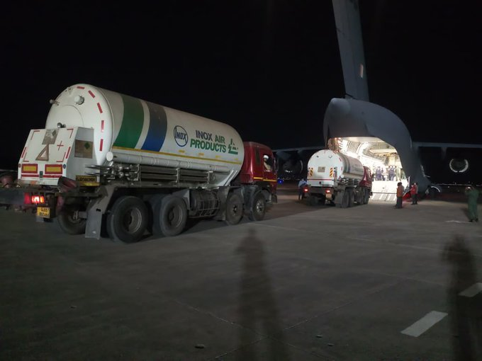 Indian Air Force is helping in the faster movement of oxygen to medical facilities during the current surge in COVID19. The airlifts are being coordinated by MHA. Two empty liquid oxygen tankers from Indore reached Jamnagar today: Ministry of Home Affairs (MHA)