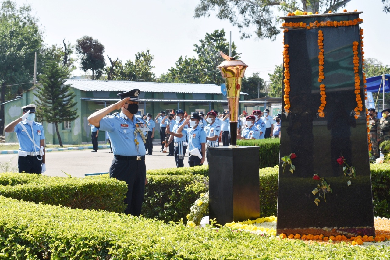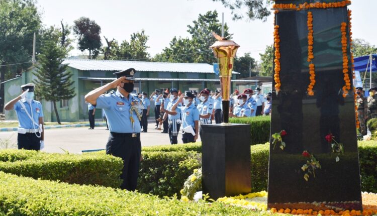 Jammu: “Swarnim Vijay Varsh” is being celebrated throughout the year 2021 to commemorate 50th anniversary of the magnificent and overwhelming victory of the Indian Armed Forces in the 1971 war. The Victory Flame, “Swarnim Vijay Mashaal”, brought by Indian Army and escorted by the Indian Air Forces Police, was received by Air Commodore Ajay Singh Pathania, Air Officer Commanding, Air Force Station, Jammu and his team, with honour and glory. Air warriors clad in ceremonial uniform saluted the “Swarnim Vijay Mashaal” enroute with pride and honour. The “Sanginis” and children of the Base paid their respect to the Vijay Mashaal. 1971 War Veterans, other veterans, serving Air Warriors, Sanginis, NCC Cadets, Scouts and Guides and Civilian personnel of the Station assembled at the Station War Memorial to commemorate the sacrifice of War Heroes in the victory of the 1971 war. The Air Officer Commanding addressed the gathering and discussed the experiences shared by                 1971 war veterans. A documentary on 1971 war was screened at the Station Auditorium. All COVID-19 precautions were followed during the celebration of “Swarnim Vijay Varsh” at the base.