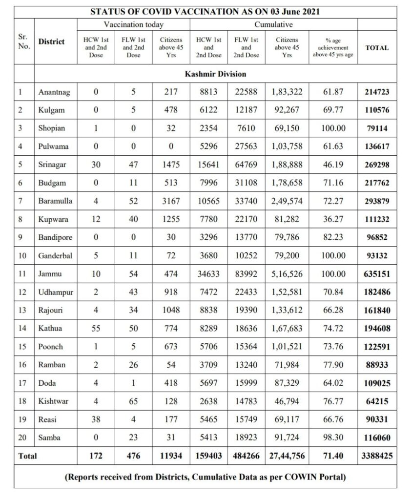 Moreover, 2694 more COVID-19 patients have recovered and discharged from various hospitals including 886 from Jammu Division and 1808 from Kashmir Division.