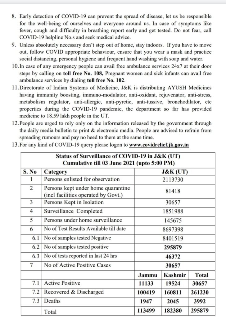 According to the daily Media Bulletin on novel Corona virus (Covid-19), out of 295879 positive cases, 30657 are Active Positive, 261230 have recovered and 3992have died; 1947in Jammu division and 2045 in Kashmir division.
