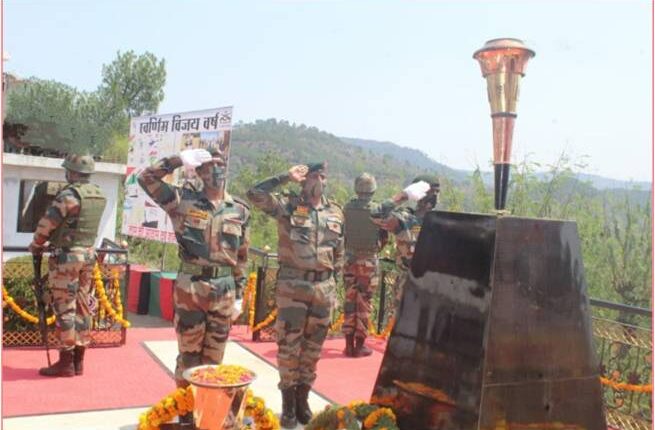 Jammu: In commemoration of 50 years of 1971 Indo-Pak war, in which the Indian Armed Forces secured a decisive and historic victory over Pakistan, nationwide celebrations started on            16 December 2020 naming year as “Swarnim Vijay Varsh”. Under this grandiose event four victory torches are being circulated in four cardinal directions pan India. The sacred victory flame was received at Kallar Junction by Commanding Officer, Rashtriya Rifles Battalion at Lam in District Rajouri (J&K). The ‘Swarnim Vijay Varsh Mashal’ was taken to the epic battle ground of Shaheed Garh, where residents of Lam had laid down their lives in protection of their motherland. An event was held at Saheed Garh, War Memorial and wreath laying ceremony was organised to pay homage to martyrs. A two minutes silence was observed in reverence to the valiant soldiers. The events of 1971 Indo-Pak war including stories of the valor and courage displayed by our soldiers were highlighted, which contributed towards achieving a momentous victory. The brave veterans shared their awe inspiring experiences of the war which was highly motivational and filled youth with enthusiasm.