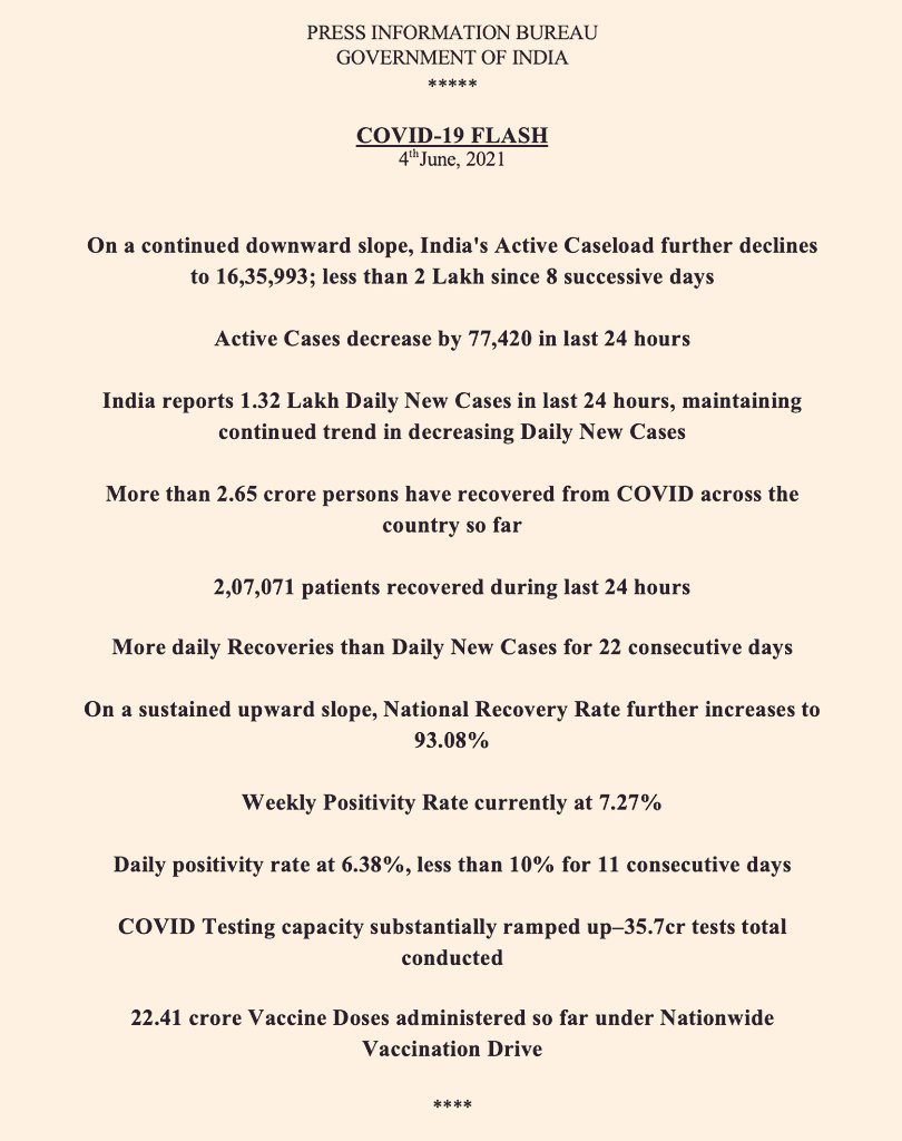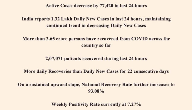 India reports 1.32 Lakh Daily New Cases in last 24 hours, maintaining continued trend in decreasing Daily New Cases