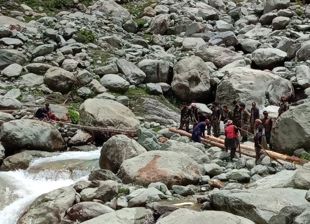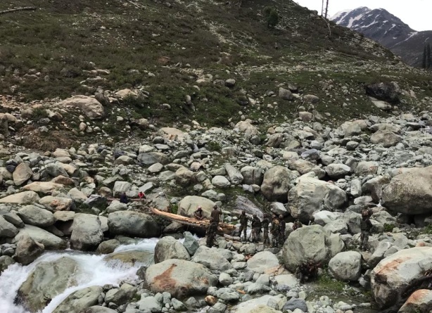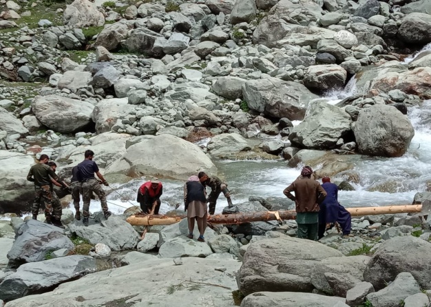 The troops deployed at Satharban in District Rajouri (J&K) found out that a Foot Bridge over the Jamian Nala had been washed away due to incessant rains during the intervening night. The Bridge was used by the nomadic Gujjars and Bakarwals to cross fast flowing Jamian Nala during their annual from plains to highland pastures in Pir Panjal mountains during summer.