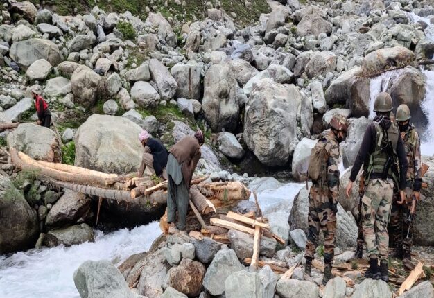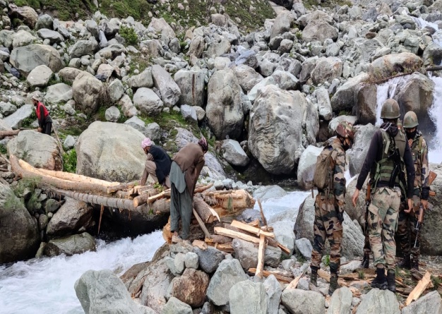 The troops deployed at Satharban in District Rajouri (J&K) found out that a Foot Bridge over the Jamian Nala had been washed away due to incessant rains during the intervening night. The Bridge was used by the nomadic Gujjars and Bakarwals to cross fast flowing Jamian Nala during their annual from plains to highland pastures in Pir Panjal mountains during summer.