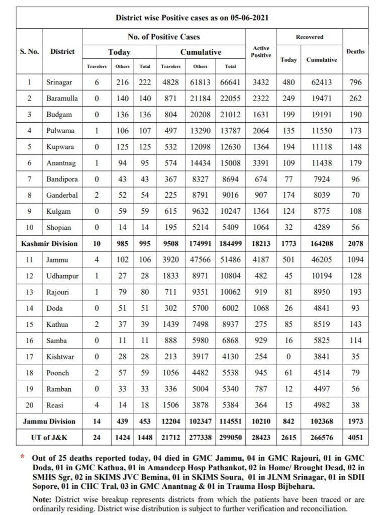 According to official health bulletin issued here, the UT had 1448 new Corona positive cases including 453 in Jammu division and 995 In Kashmir division. 995.