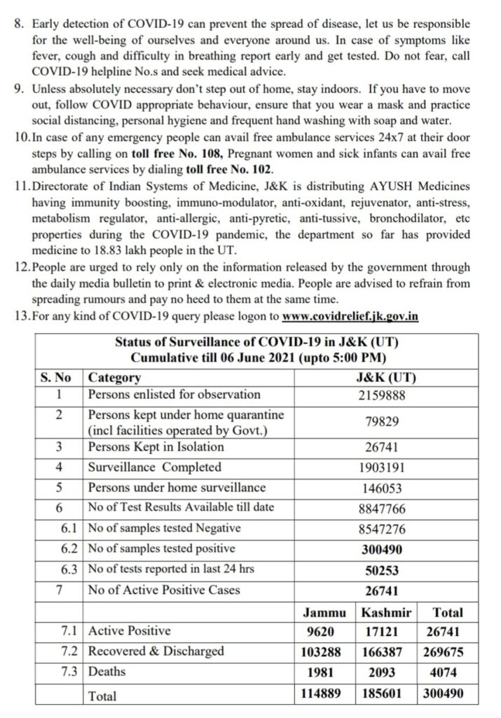 According to the daily Media Bulletin on novel Corona virus (Covid-19), out of 300490 positive cases, 26741 are Active Positive, 269675 have recovered and 4074 have died; 1981 in Jammu division and 2093 in Kashmir division.