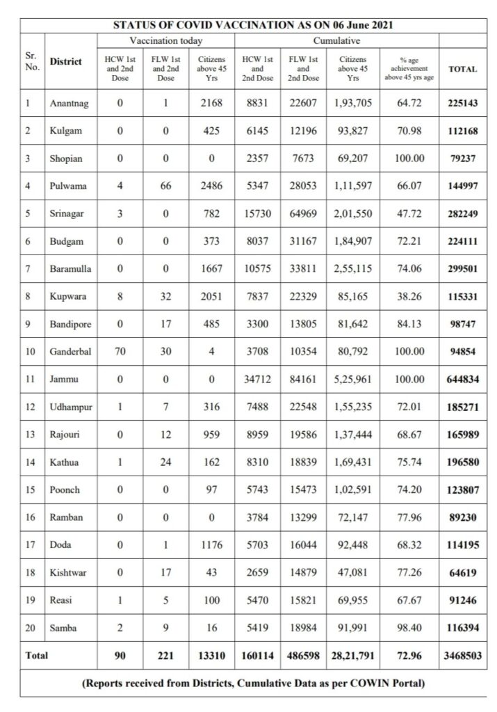 Moreover, 3099 more COVID-19 patients have been recovered and discharged from various hospitals including 920 from Jammu Division and 2179 from Kashmir Division.