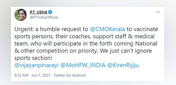 Former Olympic track & field athlete PT Usha requests Kerala CM Pinarayi Vijayan & Union Youth Affairs and Sports Kiren Rijiju, to vaccinate sportspersons, their coaches, support staff & medical team, who will participate in forthcoming Nationals & other competitions, on priority
