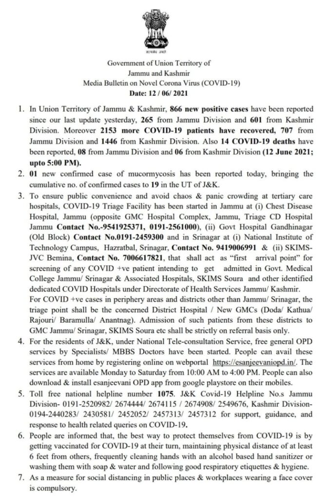 Jammu: The Union Territory of Jammu and Kashmir on Saturday reported 866 new cases of Coronavirus and 14 deaths.