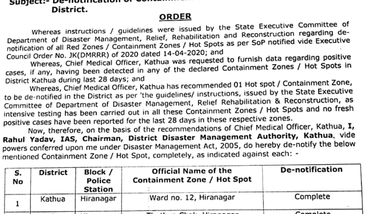 J&K | DC Kathua Rahul Yadav de-notifies Ward no 12, Hiranagar & Thutha Chak, Hiranagar as Micro Containment Zone/ Hot Spots as no fresh positive case reported in these localities in last 28 days. Uncategorized By Editor Last updated Jun 12, 2021 46 Share 46 Share