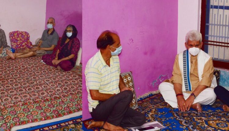 J&K LG Manoj Sinha visits family members of Tral Muncipal Committee Chief Rakesh Pandita who was killed by terrorists last week. Sanctions Rs. 40 Lakh compensation for the family. Uncategorized By Editor Last updated Jun 12, 2021 34 Share 34 Share