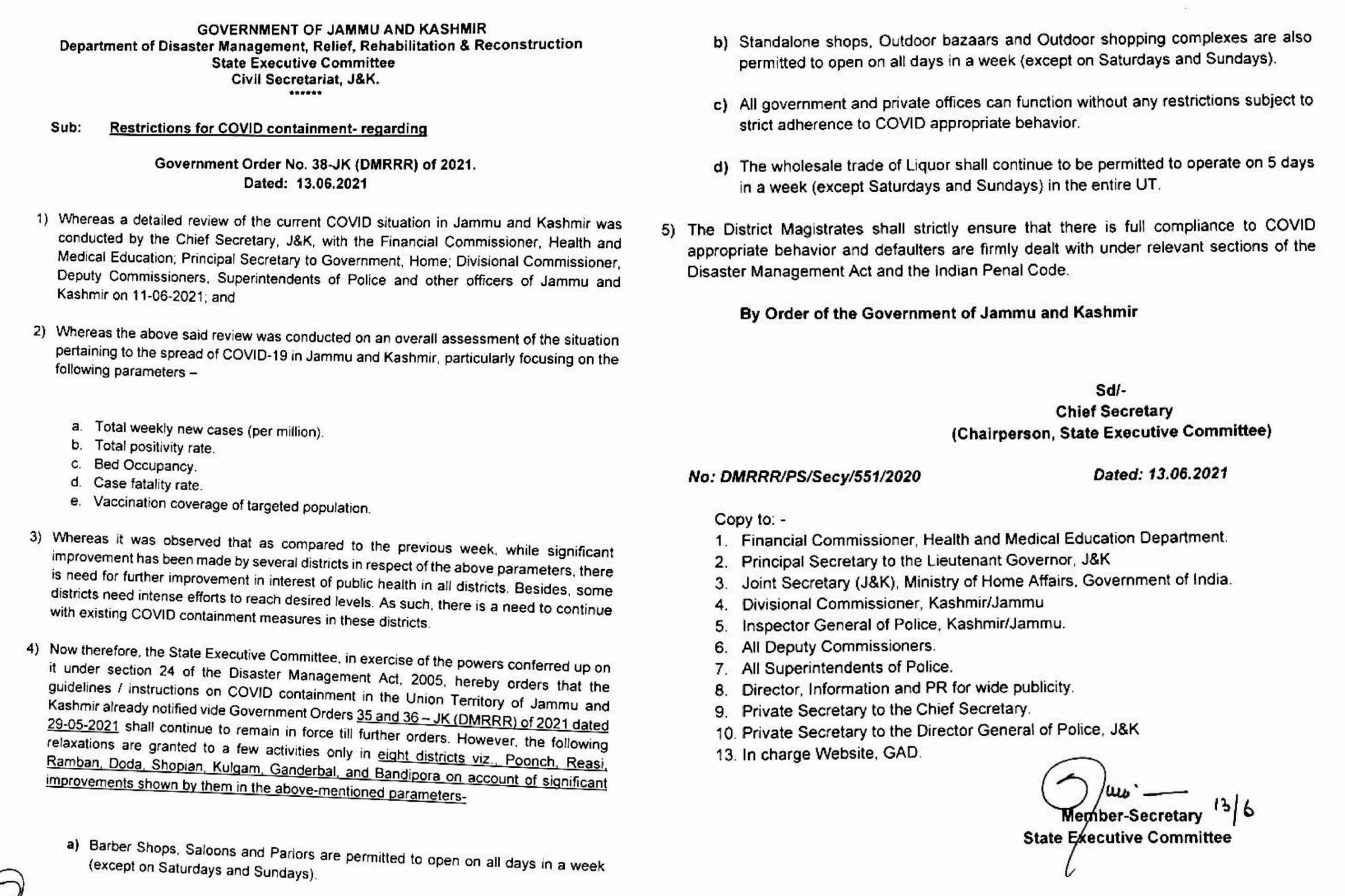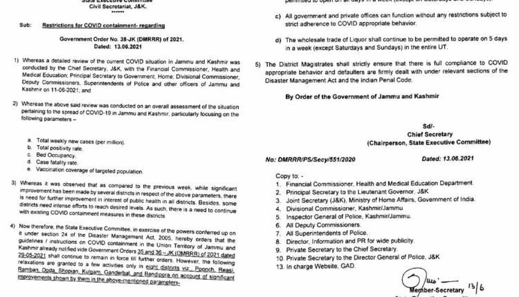 Guidelines on #COVID containment in UT notified on 29 May, will continue to remain in force till further orders. Relaxations granted to few activities in 8 dists-Poonch, Reasi, Ramban, Doda, Shopian, Kulgam, Ganderbal & Bandipora on significant improvements: Jammu & Kashmir Govt