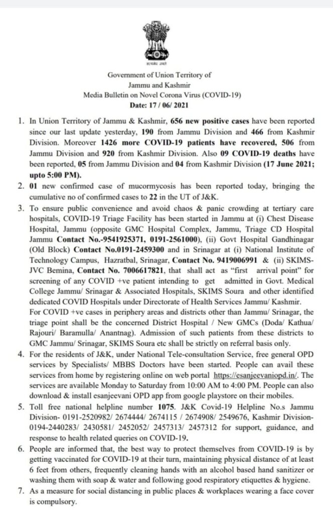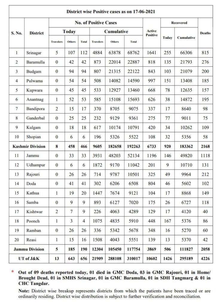 Jammu:The Jammu Kashmir on Thursday reported 656 new cases of Coronavirus including 190 in Jammu division and 466 in Kashmir.