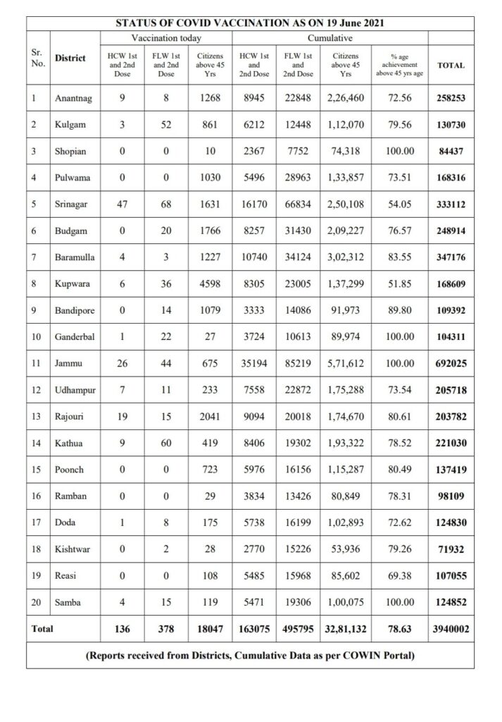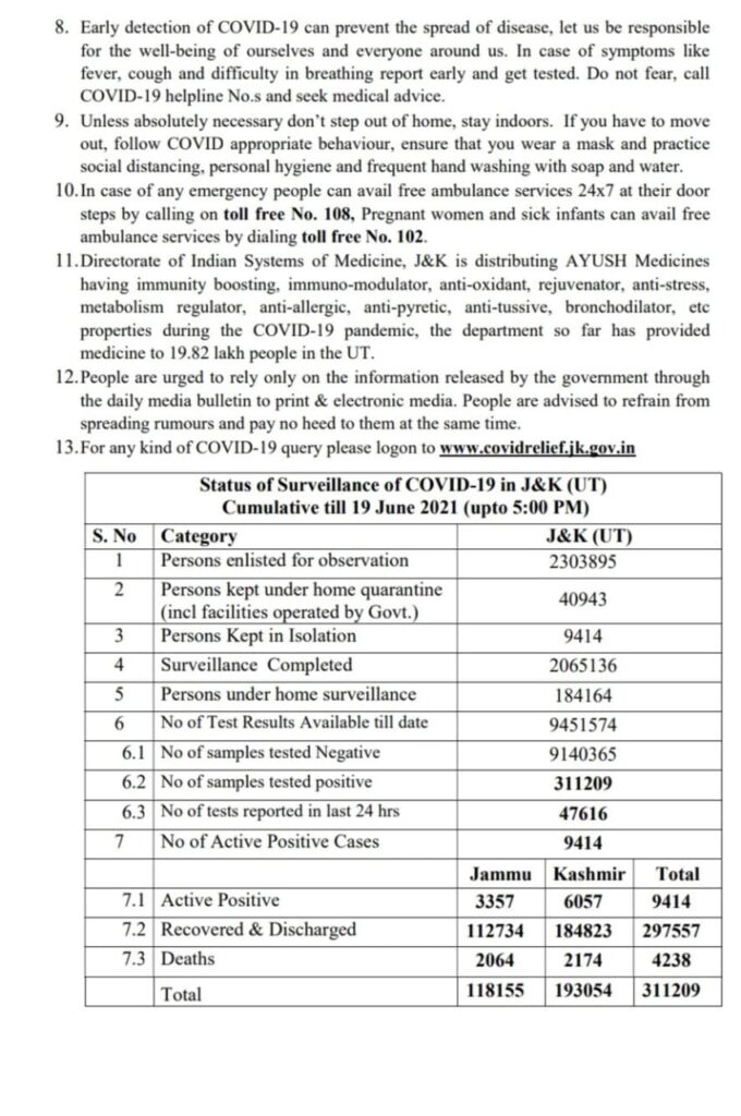 Regarding the deaths, two each were reported Jammu Division and Kashmir Valley respectively, taking the fatality count to 4238, the officials told GNS. It was the lowest death toll in 63 days, they said.