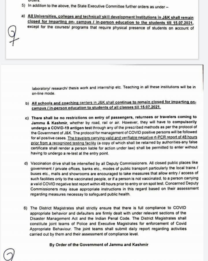 All Schools and Coaching centres in J&K shall continue to remain closed for imparting on-campus / in-person education to students of all classes till July 15, 2021