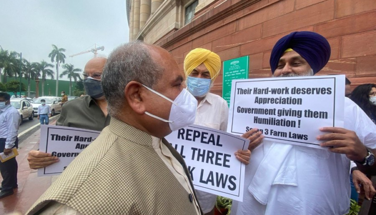 Shiromani Akali Dal (SAD) President Sukhbir Singh Badal showed a placard to Agriculture Minister Narendra Singh Tomar, during party’s protest against farm laws outside Parliament, this morning. Uncategorized By Editor Last updated Jul 20, 2021 103 Share 103 Share