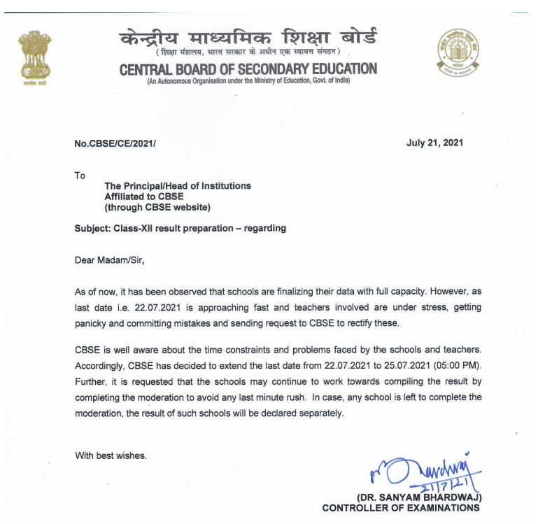 Central Board of Secondary Education (CBSE) extends the last date of finalising the class XII result, from 22nd July to 25th July (5:00 PM). Uncategorized By Editor Last updated Jul 21, 2021 67 Share 67 Share