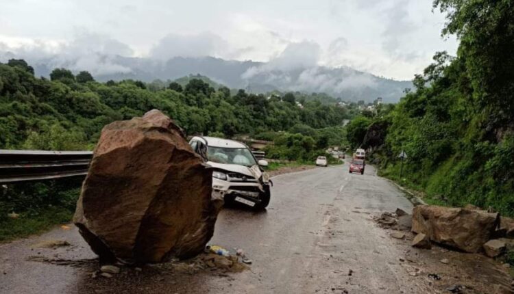 J&K | Traffic suspended on Jammu-Poonch national highway on Friday morning due to landslide triggered at Thandapani one kilometre short of Sunderbani in district Rajouri of Jammu and Kashmir.