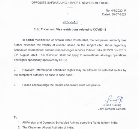 Restrictions on scheduled international passenger flights to/from India extended till August 31st, 2021: Directorate General of Civil Aviation (DGCA) Uncategorized By Editor Last updated Jul 30, 2021 21 Share 21 Share