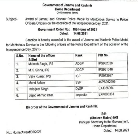 On the eve of Independence Day, 2021, J&K Government has awarded J&K Police Medal for Meritorious Service (JKMS) to 06 officers of J&K Police. Those who have been awarded with JKMS medals are Mukesh Singh IPS, ADGP, #Jammu Zone, M.K. Sinha, IPS, ADGP, Headquarters PHQ