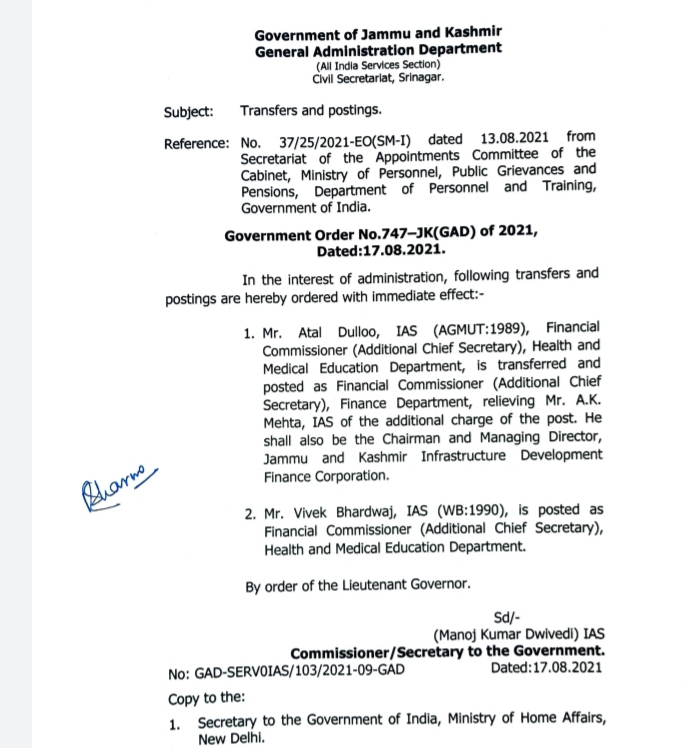 J&K Govt orders transfers and postings of IAS Officers; Dulloo gets Finance , Vivek gets Health J&K / Ladakh By Editor Last updated Sep 13, 2021 99 Share 99 Share