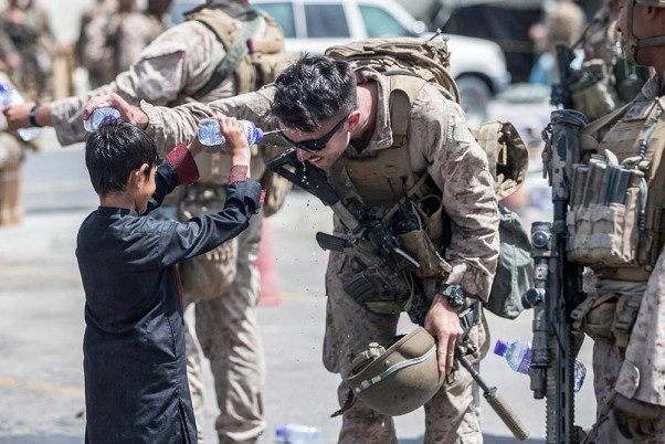 A Marine with Special Purpose Marine Air-Ground Task Force-Crisis Response-Central Command (SPMAGTF-CR-CC) and a child spray water at each other during an evacuation at Hamid Karzai International Airport in Kabul, #Afghanistan.