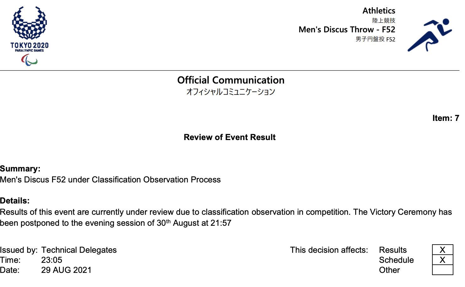 “Tokyo 2020 #Paralympics Discus Throw F52 Final event result is currently on hold due to classification review,” tweets Sports Authority of India World By Editor Last updated Aug 30, 2021 19 Share 19 Share
