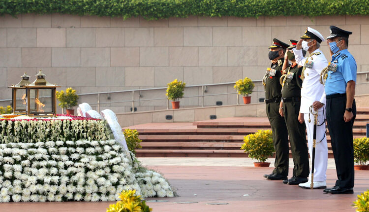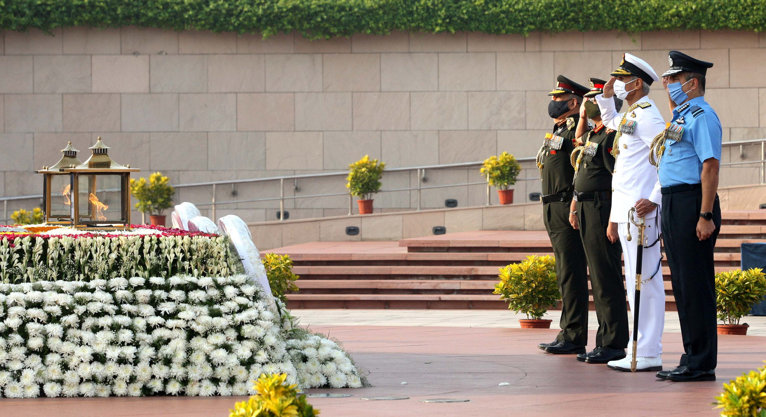 COD Staff Gen. Bipin Rawat, Chief of Army Staff Gen. M.M. Naravane, Chief of Naval Staff Adm. Karambir Singh & Chief of Air Staff Air Chief Marshal V.R. Chaudhari laying wreath and paying homage at the National War Memorial in New Delhi on the occasion of 89th Air Force Day.