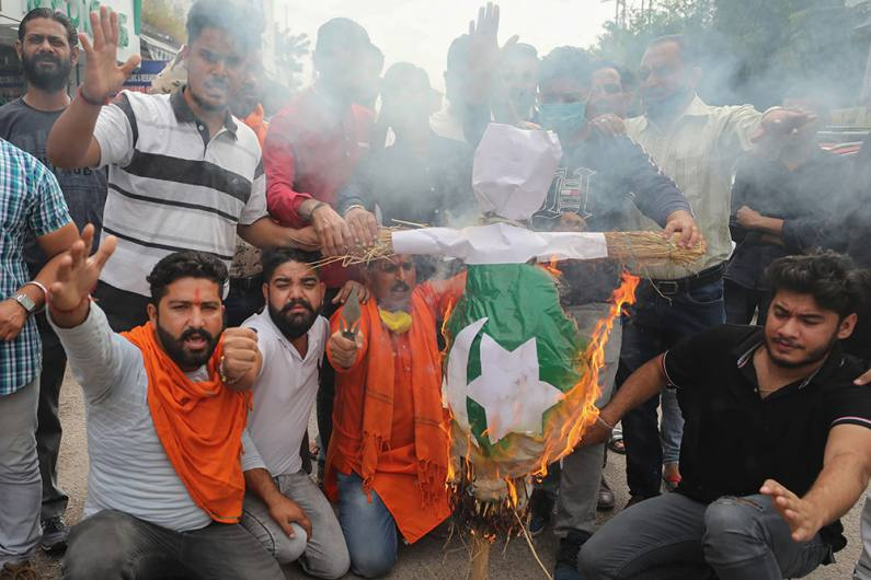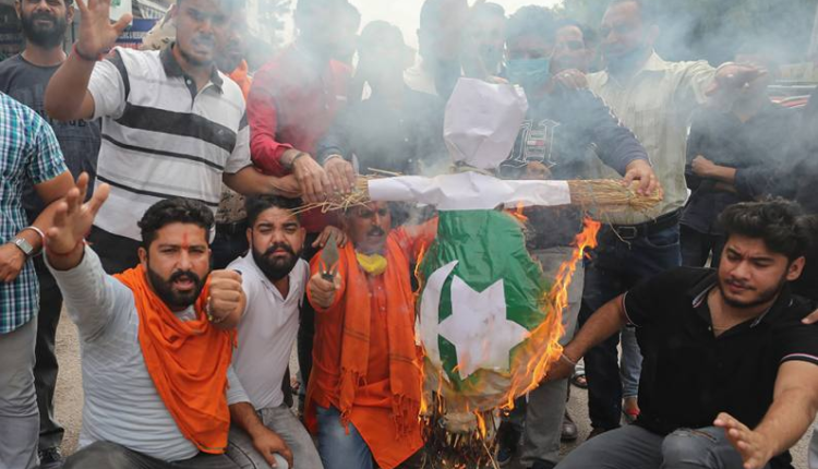 Members of Rashtriya Bajrang Dal stage a protest against the recent killings of non locals by the terrorists in Kashmir, in Jammu
