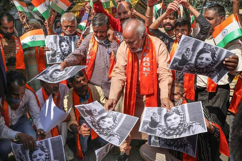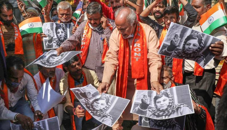 Activists of Shiv Sena and Dogra Front shout slogans as they protest against PDP President Mehbooba Mufti, in Jammu. J&K / Ladakh By Editor Last updated Oct 26, 2021 48 Share 48 Share