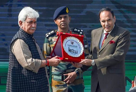 J&K Lt Governor Manoj Sinha felicitates Rajesh Bhatia, the younger son of Wg Cdr KL Bhatia who was commanding officer of Dakota DC3, during re-enactment of incidents which took place after Pakistani attackers attacked Kashmir in 1947, in Srinagar. J&K / Ladakh By Editor Last updated Oct 27, 2021 87 Share 87 Share