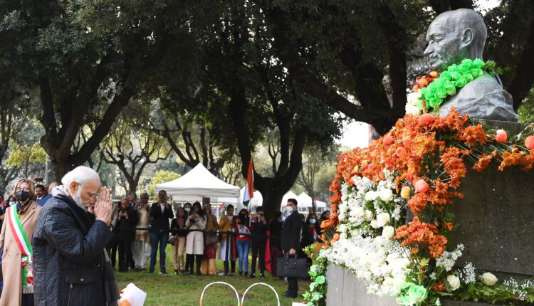 • Prime Minister Narendra Modi pays floral tribute to Mahatma Gandhi at Piazza Gandhi in Rome