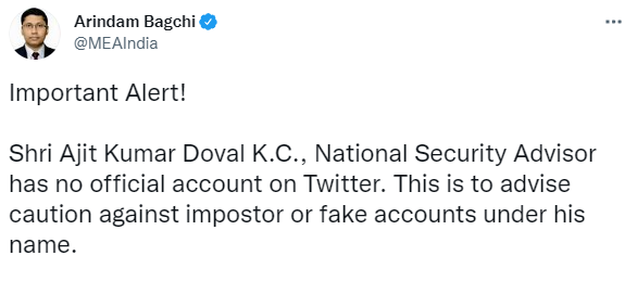 “National Security Advisor Ajit Doval has no official account on Twitter,” tweets MEA Spokesperson Nation By Editor Last updated Nov 8, 2021 155 Share 155 Share
