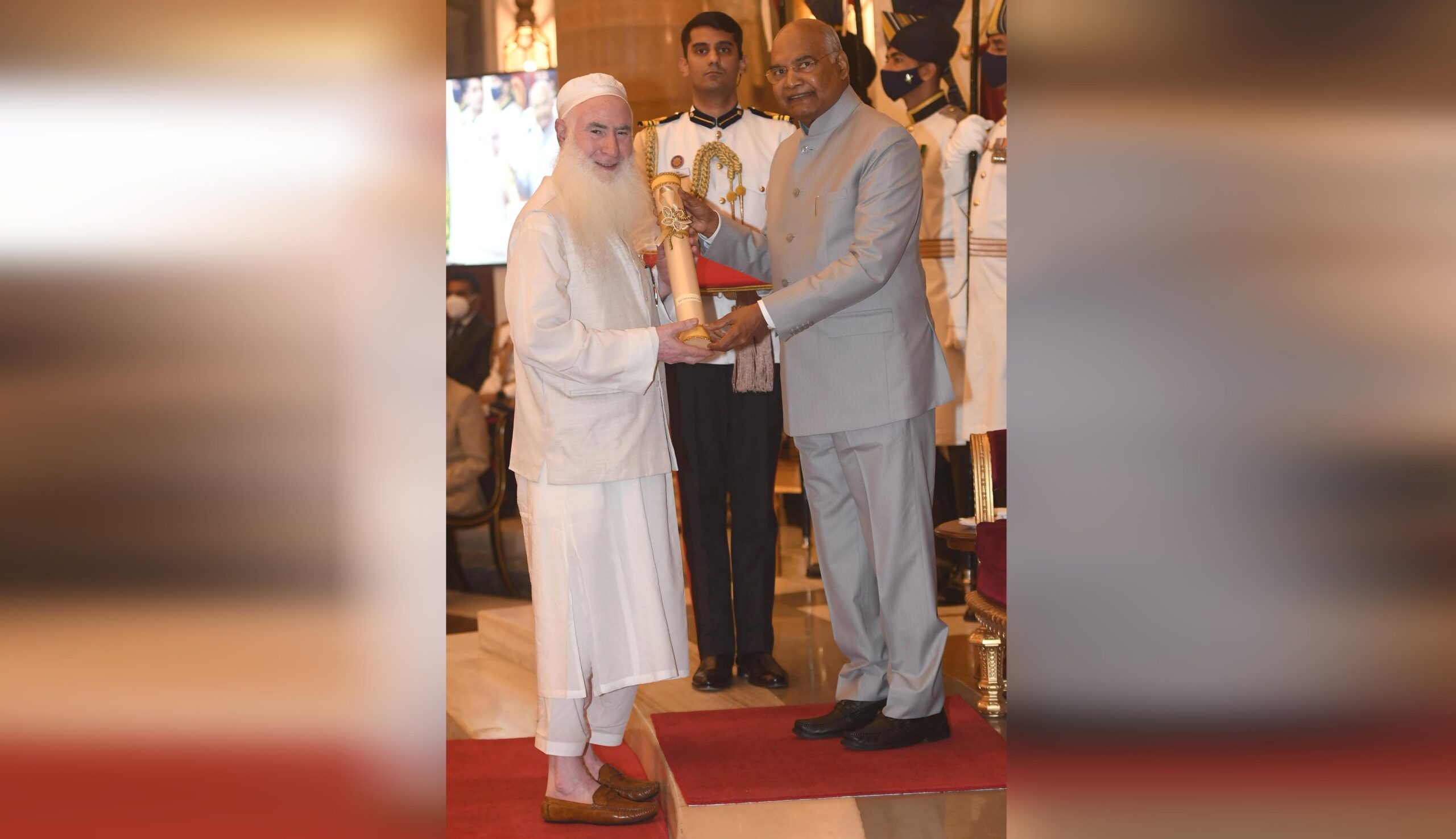 President Kovind presents Padma Shri to Haji Ghulam Rasool Khan for Art. He is a renowned artist and master craftsman from Srinagar, #JammuAndKashmir. He is globally known for teaching the innovative art of patchwork which he revived after 700 years.