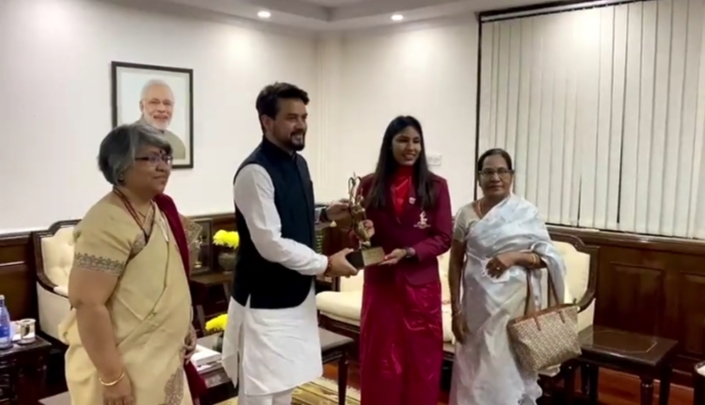 Union Youth Affairs & Sports Minister Anurag Singh Thakur conferred Arjuna Award to fencer CA Bhawani Devi today in a special event in Delhi