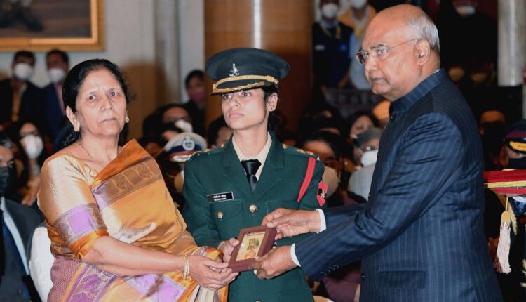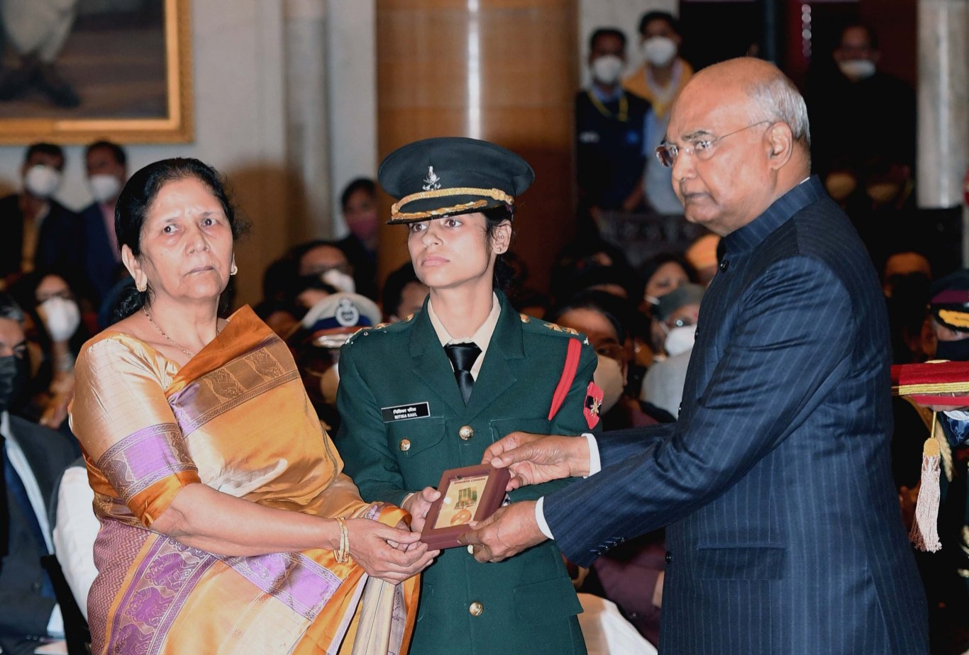 President Kovind presents Shaurya Chakra to Major Vibhuti Shankar Dhoundiyal (Posthumous), Rashtriya Rifles. He exhibited unparalleled valour and exceptional leadership qualities in various operations resulting in elimination of five terrorists & recovery of 200 kg of explosives.