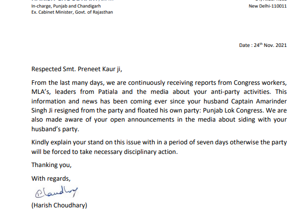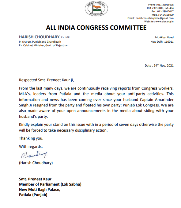 Congress’ Punjab in-charge Harish Choudhary writes to party MP Preneet Kaur, seeking explanation within 7 days on reports of her anti-party activities Nation By Editor Last updated Nov 24, 2021 54 Share otherwise the party will be forced to take necessary disciplinary action 54 Share