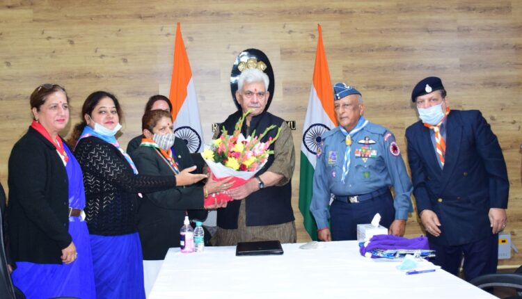 J&K Bharat Scouts & Guides delegation met Lt. Guv Manoj Sinha at Raj Bhawan regarding ongoing celebrations of Flag Day. J&K BSG to host a set of activities for a resurgent, Aatmanirbhar Bharat as part of Azadi Ka Amrut Mahotsav and also help the govt to fight drug menace.