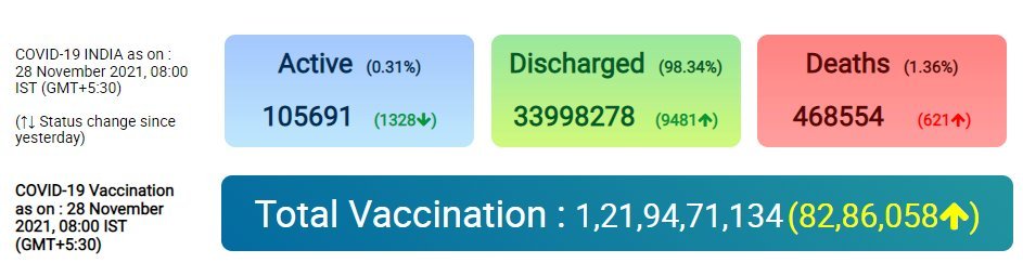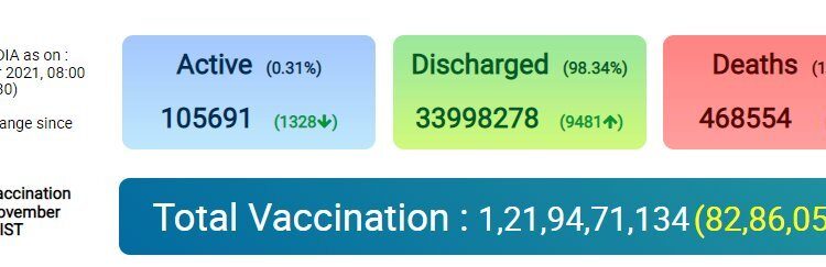 India reports 8,774 new cases, 621 deaths and 9,481 recoveries in the last 24 hours; Active caseload stands at 1,05,691; lowest in 543 days: Ministry of Health and Family Welfare Nation By Editor Last updated Nov 28, 2021 33 Share 33 Share