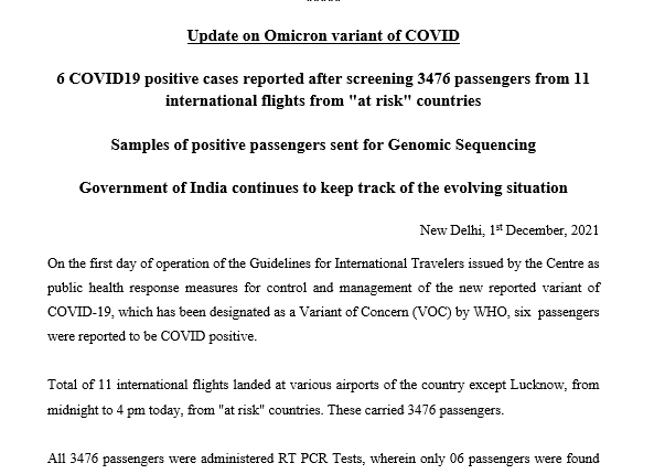 Total 11 international flights landed at various airports of the country except Lucknow, from midnight to 4 pm today, from “at risk” countries. These carried 3476 passengers. All pax were administered RT-PCR tests, wherein only 6 pax were found #COVID19 positive: Govt of India