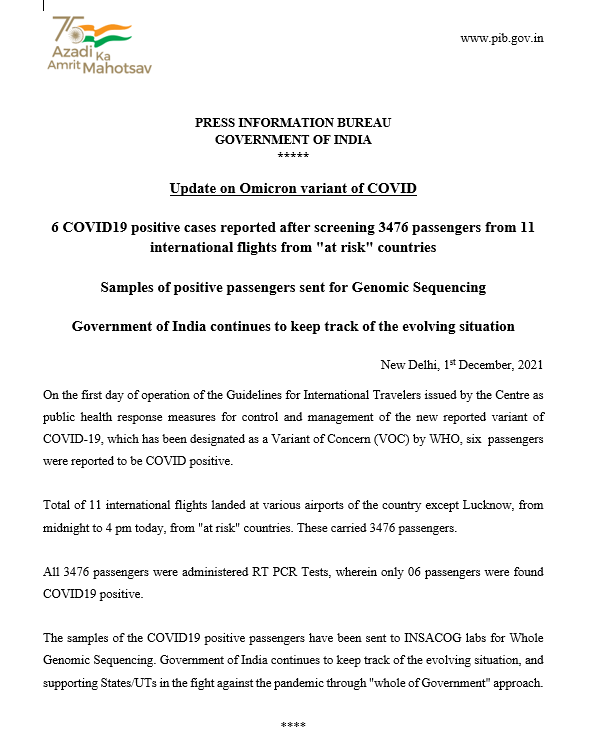The samples of the #COVID19 positive passengers have been sent to INSACOG labs for Whole Genomic Sequencing: Government of India