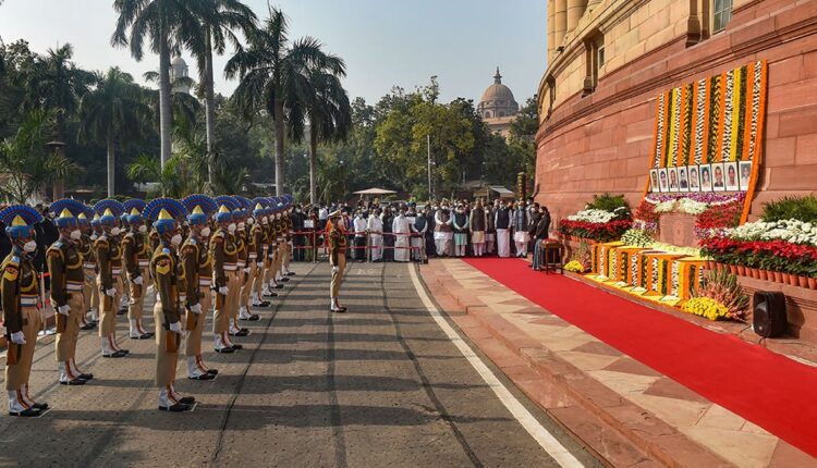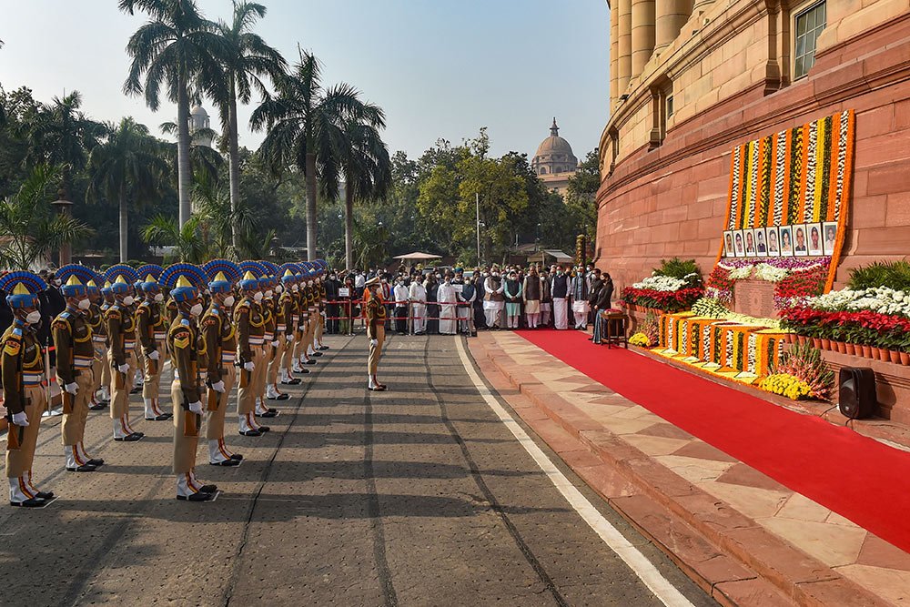 CRPF personnel pays homage to the martyrs who lost their lives in 2001 Parliament attack on the 20th anniversary at Parliament House, in New Delhi.